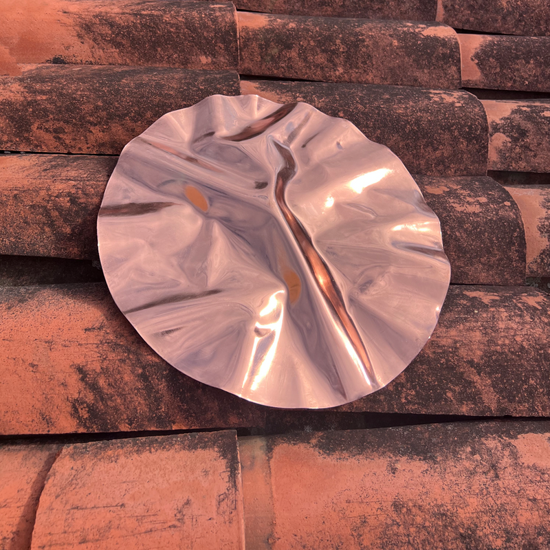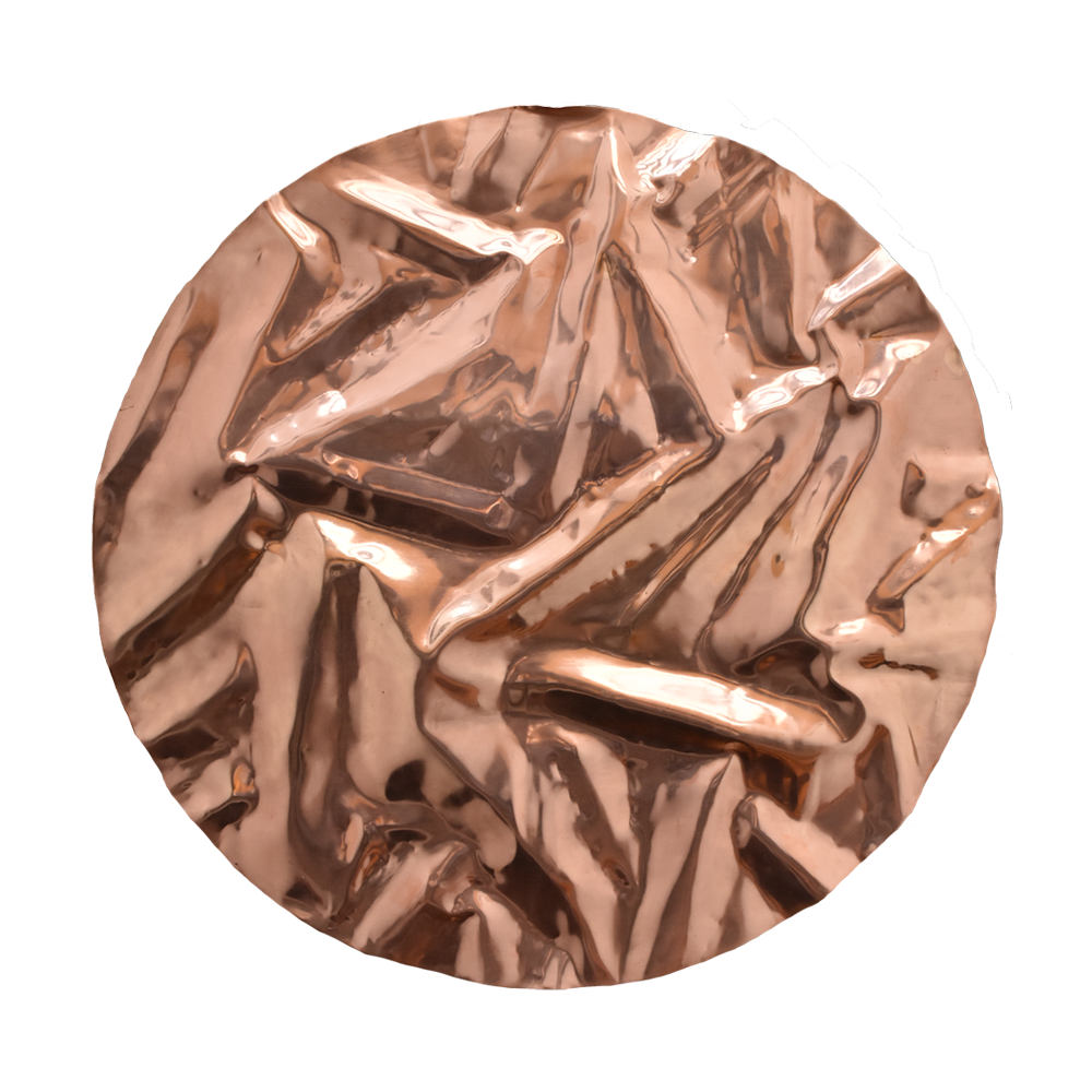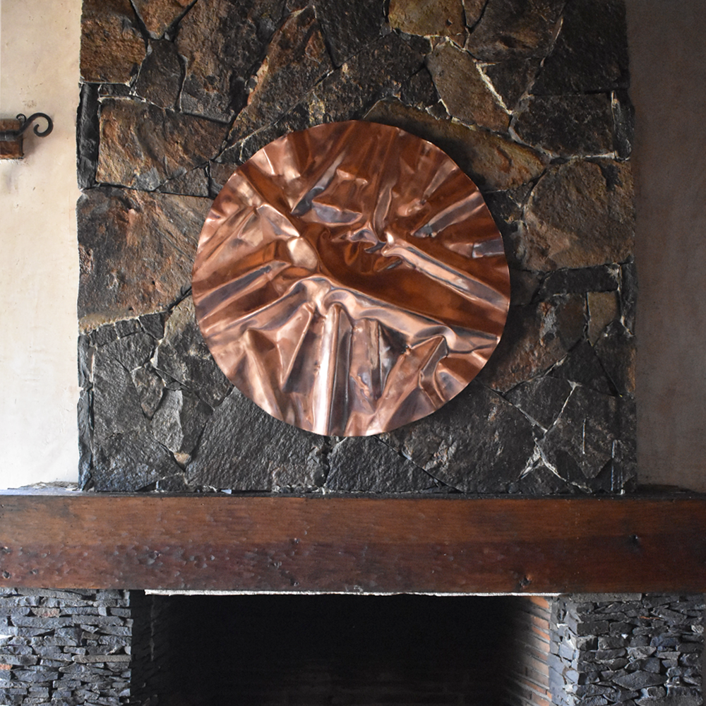 Mar de cobre es una pieza que nos recuerda al mar, imponente, hipnótico y bello. Pieza de cobre recuperado, doblado artesanalmente por manos michoacanas, al fuego.