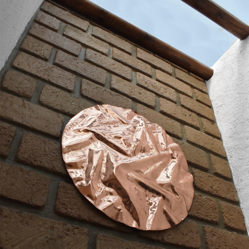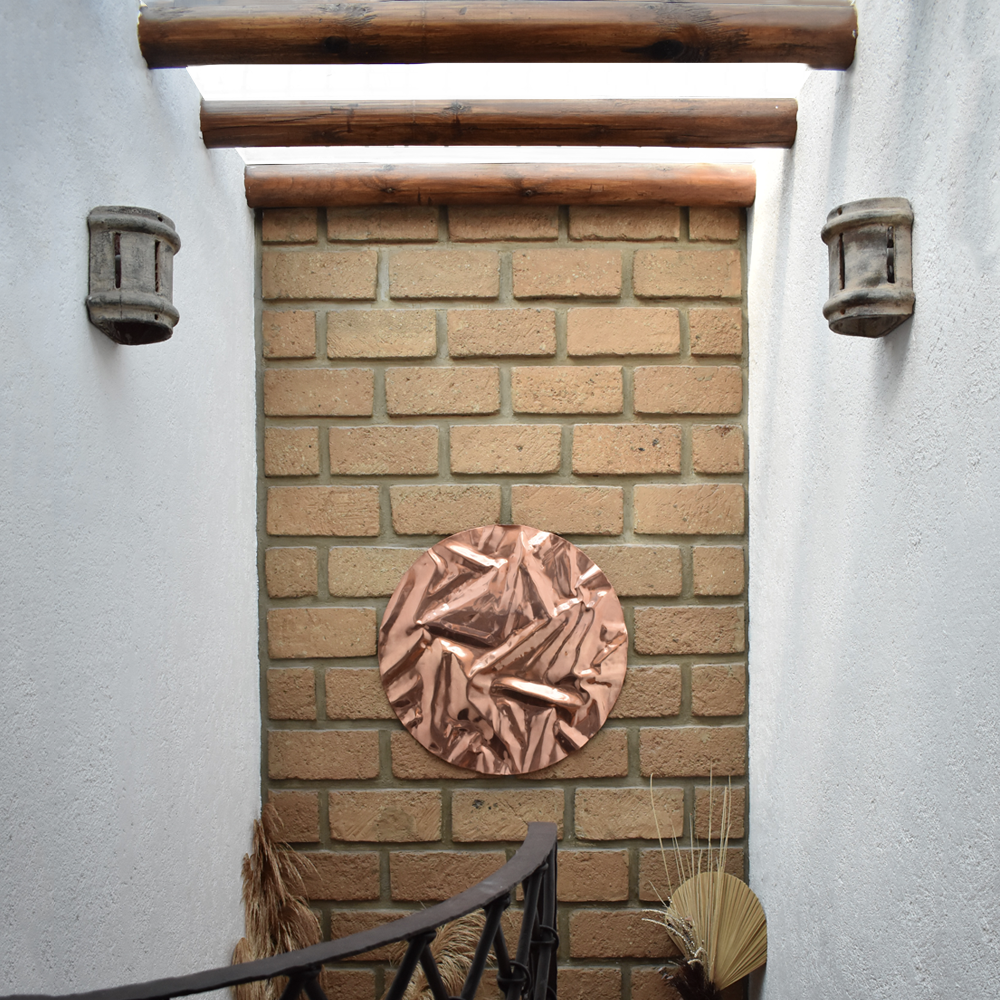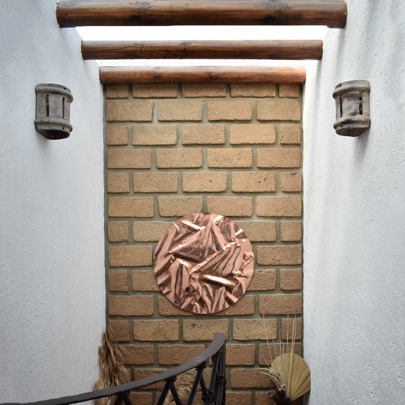 Mar de cobre es una pieza que nos recuerda al mar, imponente, hipnótico y bello. Pieza de cobre recuperado, doblado artesanalmente por manos michoacanas, al fuego.
