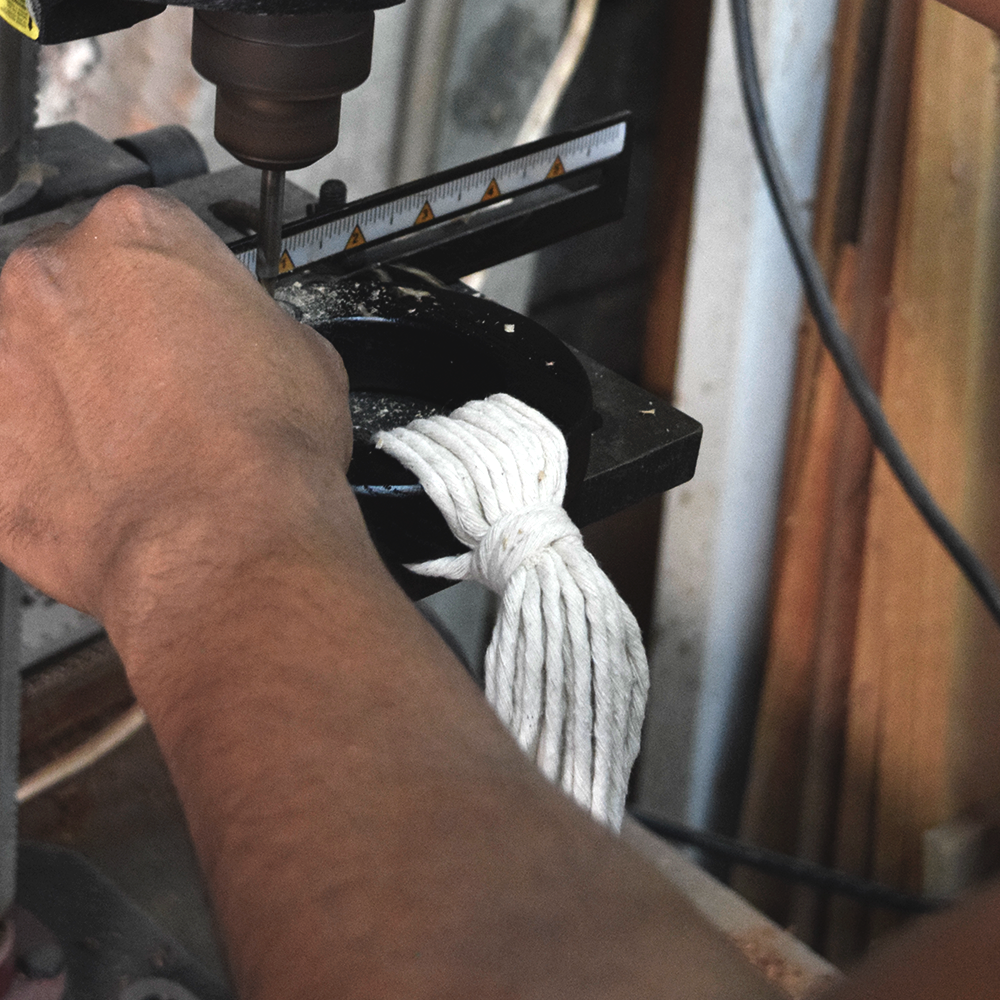 Técnica: Madera cortada y pulida a mano, cuerdas tejidas a mano.